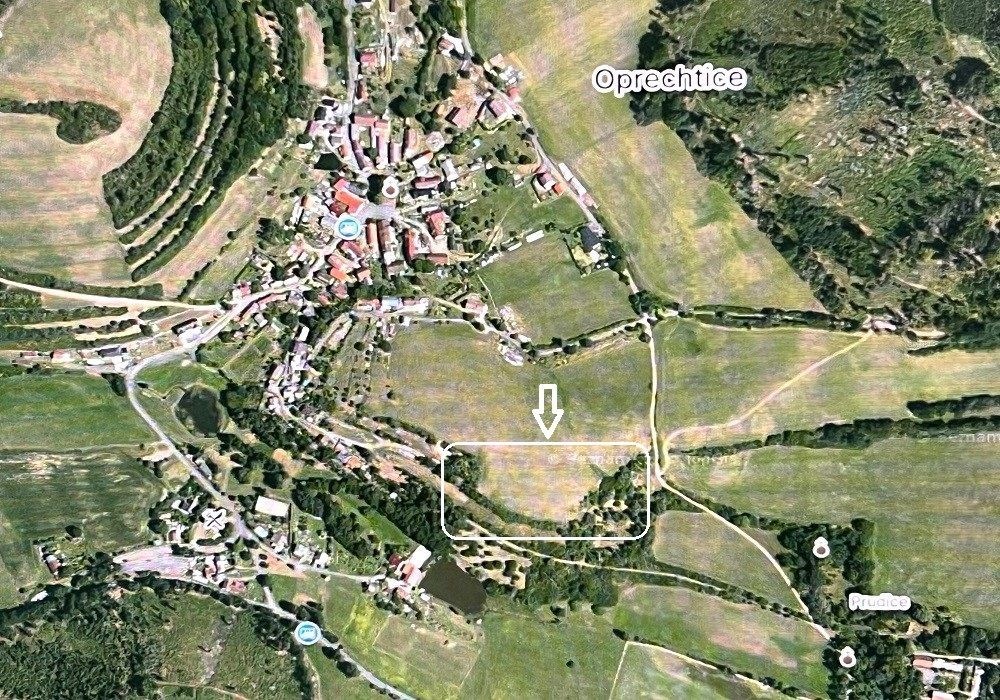 Ucelený soubor pozemků navazující na okrajové nezastavěné území obce Oprechtice s příjezdovou nezpevněnou cestu v přírodní lokalitě volných zemědělských a ostatních ploch pozemků k rostlinné produkci a případně k rekreačnímu využití, mimo zastavitelné území obce. Soubor pozemků je dle platného územního plánu součástí tzv. smíšených ploch nezastavitelného území zemědělsky obdělávaného půdního fondu vč. přístupových komunikací, určených k zemědělské výrobě jako samostatná zemědělská plocha a ostatní plocha tvořící část původní lokální pískovny, bez stávající možnosti využití pozemků k jakékoli výstavbě. Pozemky (dle evidence KN trvalý travní porost a ostatní plochy) pravidelného tvaru s plochou původní přístupové cesty, situované v mírně svažitém terénu s orientací a svažitostí pozemků na jihozápad s panoramatickým výhledem do otevřené krajiny. Pozemky jsou bez jakýchkoliv stávajících staveb, budov a zpevněných venkovních úprav, neoploceny s trvalým travním porostem, náletovými vrostlými dřevinami a keři, tvořící hospodářskou plochu a mez se vzrostlými keři, dostupné z původní veřejné cesty. Většinová plocha pozemků je vhodná a využitelná k zemědělské produkci a z části k případnému rekreačnímu klidovému využití. Pozemky bez stávajícího napojení na jakékoliv rozvody inženýrských sítí. Výměra pozemků celkem: 9.431 m2.